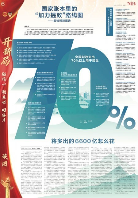 3月7日,《中國青年報》兩會特刊推出可視化版面解讀預算報告中的重要數(shù)據(jù)“70%”——連續(xù)5年全國財政支出70%以上用于民生。通過突出這一大數(shù)據(jù),凸顯本屆政府執(zhí)政為民的理念。整版通過數(shù)據(jù)的變化,解讀預算報告,呈現(xiàn)“積極財政政策提力增效的路線圖”。