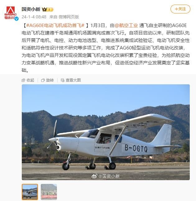 央視網(wǎng)消息:據(jù)@國資小新 消息,1月3日,由@航空工業(yè) 通飛自主研制的AG60E電動飛機在建德千島湖通用機場圓滿完成首次飛行。自項目啟動以來,研制團隊先后開展了電機、電控、動力電池選型、電推進系統(tǒng)集成試驗驗證、電動飛機安全性和適航符合性設(shè)計技術(shù)研究等多項工作,完成了AG60輕型運動飛機電動化改裝,為電動飛機產(chǎn)品開發(fā)和現(xiàn)役固定翼飛機電動化改裝積累了寶貴經(jīng)驗,為搶抓航空動力變革戰(zhàn)略機遇,推進戰(zhàn)略性新興產(chǎn)業(yè)布局,促進低空經(jīng)濟產(chǎn)業(yè)發(fā)展奠定了堅實基礎(chǔ)。