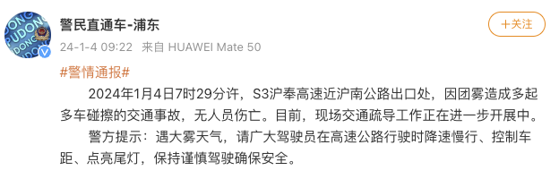 央視網(wǎng)消息:據(jù)警民直通車-浦東通報,1月4日7時29分許,S3滬奉高速近滬南公路出口處,因團(tuán)霧造成多起多車碰擦的交通事故,無人員傷亡。目前,現(xiàn)場交通疏導(dǎo)工作正在進(jìn)一步開展中。