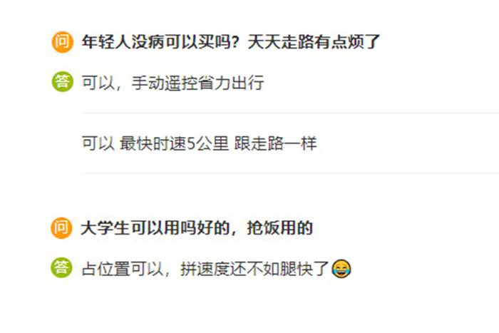 中新財(cái)經(jīng)注意到,在電商平臺(tái)上電動(dòng)輪椅的問(wèn)答區(qū),不少消費(fèi)者都對(duì)電動(dòng)輪椅展現(xiàn)出了濃厚的興趣,“年輕人沒(méi)病可以買(mǎi)嗎?天天走路有點(diǎn)煩了。”“大學(xué)生可以用嗎?”“食堂搶飯用!神器?!薄澳贻p人也可以用,省力出行。”
