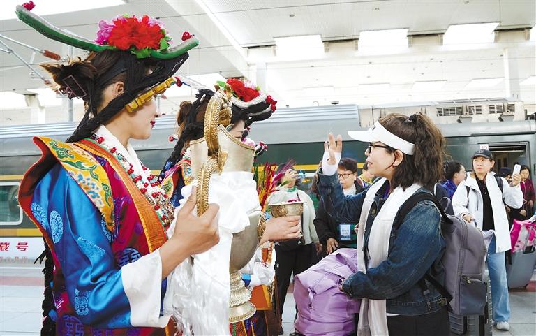 游客們走下列車,被眼前的一切深深吸引。他們有的拿出手機,記錄下這難忘的瞬間,有的則沉浸在這歡樂的氛圍中,感受著京藏兩地的深厚情誼。