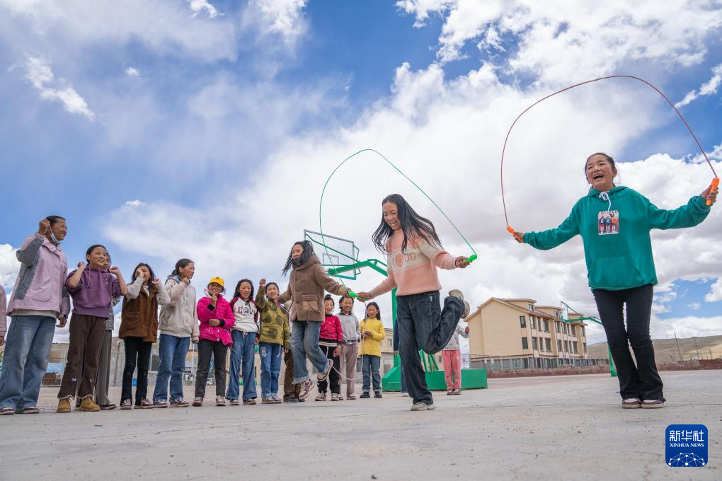 班戈縣中石化小學(xué)學(xué)生尼瑪措姆(右二)和同學(xué)們?cè)诓賵?chǎng)上跳繩(6月22日攝)。