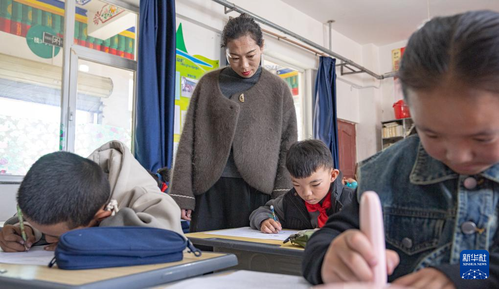 班戈縣中石化小學(xué)的老師德吉措姆在督促學(xué)生完成試卷(6月22日攝)。
