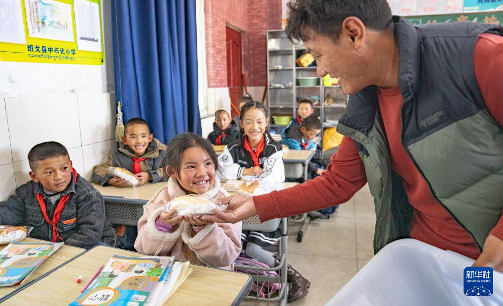 班戈縣中石化小學(xué)后勤副校長(zhǎng)尼旦為學(xué)生們分發(fā)營(yíng)養(yǎng)餐(6月22日攝)。