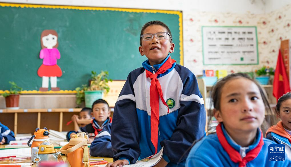 娘蒲鄉(xiāng)中心小學(xué)學(xué)生貢喬熱旦正在課堂上回答問題(9月3日攝)。新華社記者 丁增尼達(dá) 攝