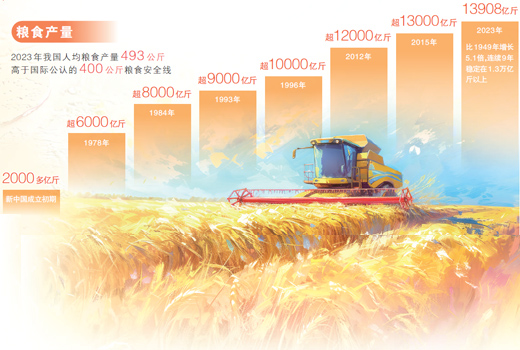 豐收成色十足?!安丶Z于地、藏糧于技”戰(zhàn)略深入實(shí)施,我國(guó)糧食綜合生產(chǎn)能力穩(wěn)步提升,連續(xù)9年穩(wěn)定在1.3萬億斤以上。截至2023年,全國(guó)綠色、有機(jī)、名特優(yōu)新和地理標(biāo)志農(nóng)產(chǎn)品認(rèn)證登記總數(shù)達(dá)到7.5萬個(gè)。蔬菜水果品種琳瑯滿目,居民的“菜籃子”“果盤子”更加豐富。