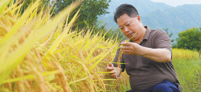 溫明生查看水稻長(zhǎng)勢(shì)。記者 王 丹攝
