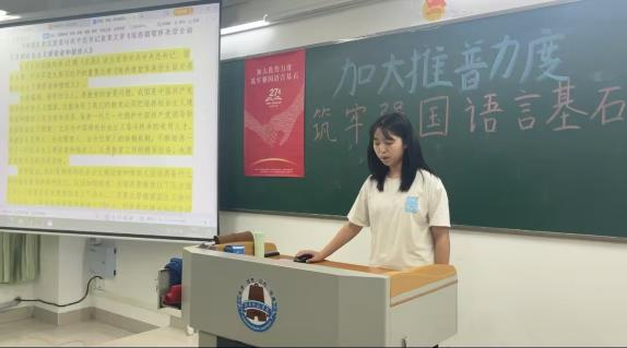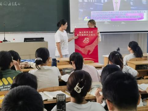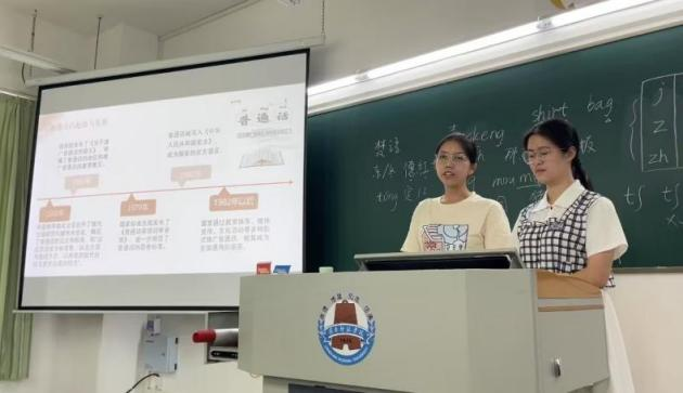 新學(xué)期伊始,《教師語言》課程教學(xué)團(tuán)隊將推普宣傳與課程的“音韻筑基”內(nèi)容相結(jié)合,理論層面講解我國通用語言文字的相關(guān)法律政策和普通話聲、韻、調(diào)等基礎(chǔ)知識;實踐層面指導(dǎo)學(xué)生利用中國語言文字?jǐn)?shù)字博物館、師圈小程序等課程資源進(jìn)行學(xué)習(xí),邀請學(xué)生介紹普通話的發(fā)展歷程和我國第27屆推普宣傳主題中所滲透的“強國必須強語,強語助力強國”價值內(nèi)涵。