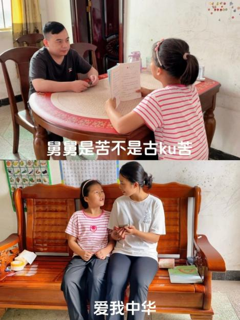 20級畢業(yè)生龍源天在清遠(yuǎn)市連州市龍坪鎮(zhèn)中心小學(xué)進(jìn)行推普創(chuàng)新實踐,指導(dǎo)學(xué)生借助手勢舞誦讀《古朗月行》,并將推普工作與家庭教育緊密結(jié)合,策劃與指導(dǎo)“普通話進(jìn)家庭”活動。小朋友們化身為普通話小老師,糾正家長的發(fā)音,與家長共同學(xué)習(xí)、共同進(jìn)步,提高了家長們的語言規(guī)范意識;親子同唱《愛我中華》經(jīng)典歌曲,讓推普成為家庭文化的一部分,家庭成員之間的情感得以加深,更在孩子們心中種下了愛國愛家的種子。