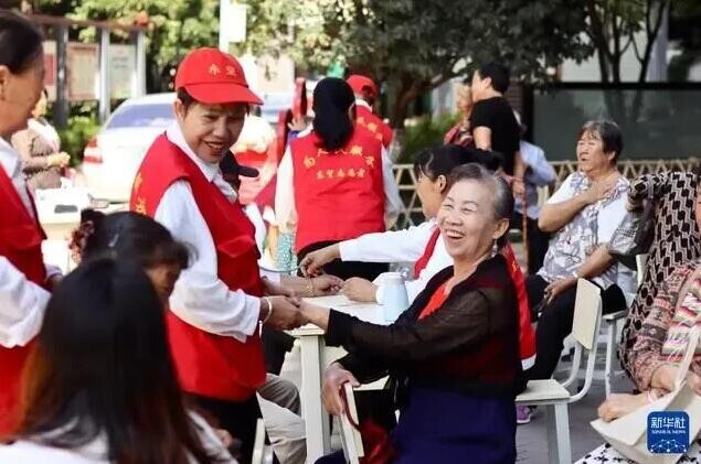 民族團結(jié)進步創(chuàng)建進社區(qū)。這是9月20日,獲評“全國民族團結(jié)進步模范集體”的昆明市盤龍區(qū)聯(lián)盟街道小壩社區(qū)志愿者為居民提供志愿服務。(莫欣竹 攝)