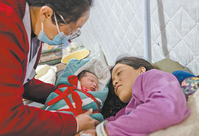 1月10日,日喀則市定日縣人民醫(yī)院婦產(chǎn)科醫(yī)生在照看一對母子。這名新生兒在9日剛剛出生。本報(bào)記者 張武軍攝
