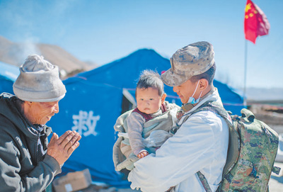 1月9日,在定日縣長所鄉(xiāng)古榮村安置點(diǎn),受災(zāi)群眾感謝西藏軍區(qū)陸軍某部隊(duì)衛(wèi)生員的醫(yī)療救治。人民網(wǎng)記者 翁奇羽攝