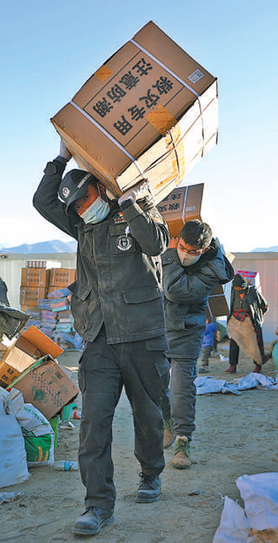 1月10日,日喀則市特警在古榮村安置點(diǎn)同受災(zāi)群眾一起搬運(yùn)物資。人民日報(bào)記者 張武軍攝