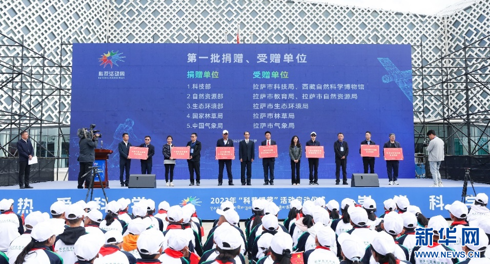 國家林草局科技司帶隊(duì)出席啟動(dòng)儀式,并組織有關(guān)單位向拉薩市林草局捐贈(zèng)林草科普物資。(新華社發(fā) 宋平 攝)