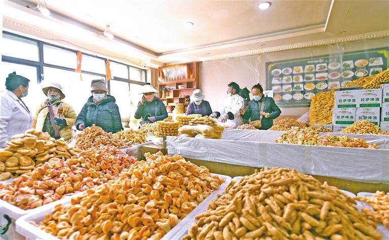 隨著藏歷新年日益臨近,拉薩街頭巷尾各種琳瑯滿(mǎn)目的“藏式”年貨,讓年味兒越來(lái)越濃,而構(gòu)成這年味兒最重要的元素之一就是“卡賽”的香味兒?!翱ㄙ悺笔且环N油炸面食,是藏歷新年必不可少的食物。藏歷新年前夕,古城拉薩各個(gè)加工銷(xiāo)售“卡賽”的店鋪飄出陣陣香味。