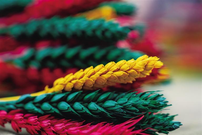 從春耕、夏耘、秋收到冬天的染色、晾干、捆綁、售賣,“羅薩梅朵”的制作過程并不簡(jiǎn)單,種植和上色都極其辛苦。卓瑪次仁告訴記者:“每年4月,我們開始種植小麥和青稞,澆水施肥。9月收割時(shí),我們會(huì)挑選顆粒飽滿的麥穗和青稞穗,捆綁后去皮曬干。10月,將它們收入屋中,一層層壘起來,房間最好朝陽且沒有老鼠。11月,開始采購(gòu)顏料和捆扎用的毛線?!?/p>