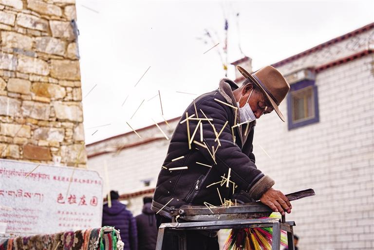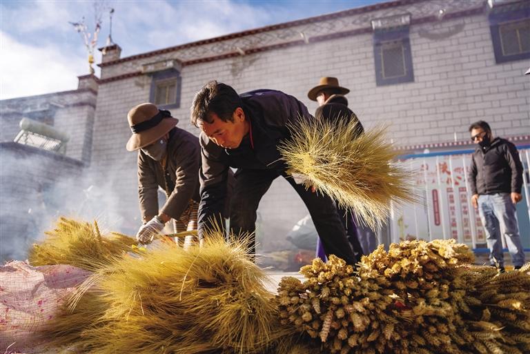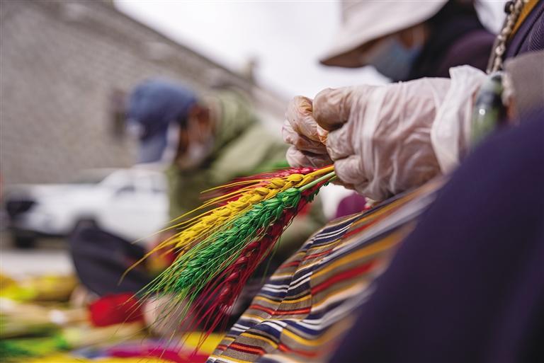 每年12月起,桑木村處處可見“羅薩梅朵”。清晨,天還未亮,村民們就已忙碌起來。有人將制作好的“羅薩梅朵”打包送往拉薩市區(qū)售賣,有人則繼續(xù)為剩下的麥穗和青稞穗上色、曬干?!拔覐男】粗L(zhǎng)輩們制作‘羅薩梅朵’,7歲就開始幫忙捆綁,20歲開始獨(dú)立制作。每到這個(gè)時(shí)候,我就知道新年快到了。”64歲的村民卓瑪次仁回憶道。