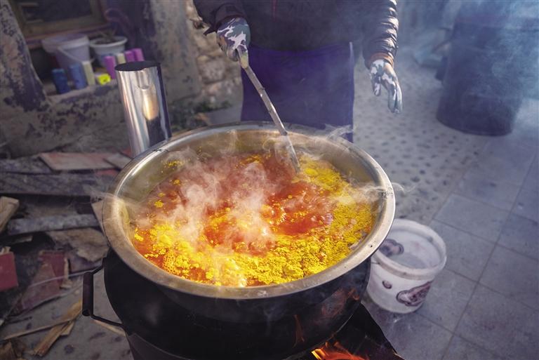 “玫紅色和黃色的都做完了吧?這個(gè)顏料水我倒了,開始準(zhǔn)備制作青色?!币慌?,61歲的央金將盆洗干凈,繼續(xù)煮水放入顏料。“‘羅薩梅朵’有青色、綠色、玫紅色、黃色四種顏色,其中青色耗時(shí)最長(zhǎng),不僅需要自己調(diào)制,而且最難上色?!毖虢鹫f,“我們一般是早上7點(diǎn)開始上色,上完色都快下午4點(diǎn)了。”