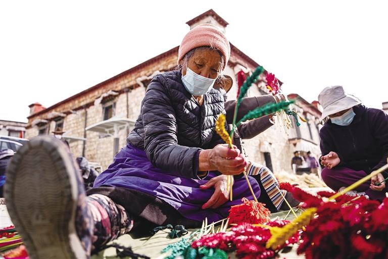 以前,高原植被稀疏,冬日里鮮花更是罕見。人們制作“羅薩梅朵”,讓這一束束“人造的花朵”盛開在冬日的高原上,這體現(xiàn)了西藏群眾對(duì)美好生活的熱愛和追求。正如央金所說,隨著西藏群眾物質(zhì)生活水平的提高,色彩越來越鮮艷、品質(zhì)越來越高的“羅薩梅朵”,正是西藏群眾多姿多彩幸福生活的絕佳體現(xiàn)。