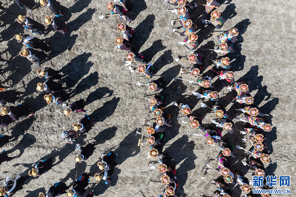 圖為西藏山南市乃東區(qū)門中崗社區(qū)春耕儀式現(xiàn)場(3月16日攝,無人機(jī)照片)。新華網(wǎng) 旦增努布 攝