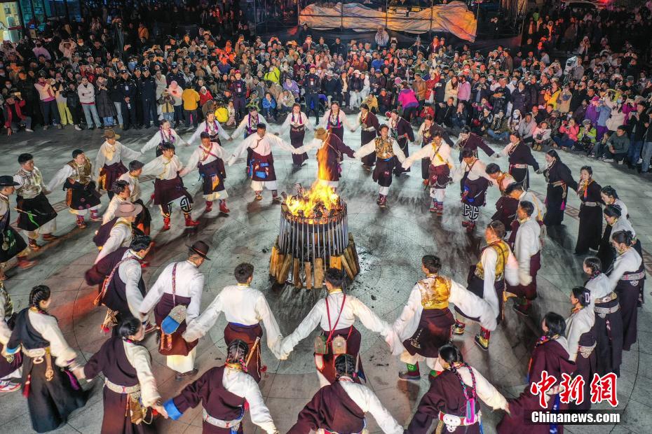 4月1日晚,西藏自治區(qū)林芝市第二十二屆桃花旅游文化節(jié)波密縣分會場的篝火鍋莊晚會熱鬧開場。晚會現(xiàn)場,熊熊篝火照亮夜空,當(dāng)?shù)孛癖娚碇?jié)日盛裝與游客手拉手,圍繞篝火跳起歡快的鍋莊舞,舞步輕盈、姿態(tài)優(yōu)美。熱情奔放的旋律,洋溢著濃郁的民族風(fēng)情,讓現(xiàn)場變成歡樂的海洋。此次活動不僅展現(xiàn)了波密獨(dú)特的民俗文化魅力,也為桃花節(jié)增添了別樣色彩,吸引更多游客領(lǐng)略林芝波密縣春日盛景與人文風(fēng)情。圖為篝火鍋莊晚會現(xiàn)場。(無人機(jī)照片)