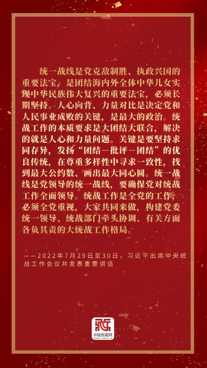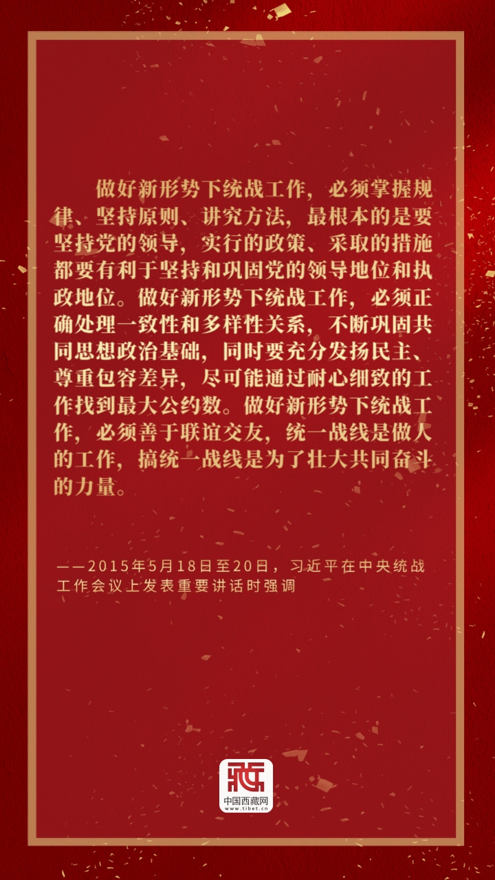 統(tǒng)一戰(zhàn)線是中國(guó)共產(chǎn)黨在中國(guó)革命中戰(zhàn)勝敵人的一個(gè)重要法寶。黨的十八大以來(lái),以習(xí)近平同志為核心的黨中央把統(tǒng)一戰(zhàn)線和統(tǒng)戰(zhàn)工作擺在全黨工作的重要位置,努力團(tuán)結(jié)一切可以團(tuán)結(jié)的力量、調(diào)動(dòng)一切可以調(diào)動(dòng)的積極因素,畫(huà)出最大同心圓,為黨和人民事業(yè)不斷發(fā)展?fàn)I造了十分有利的條件。讓我們一起品讀習(xí)近平總書(shū)記關(guān)于統(tǒng)戰(zhàn)工作的“金句”,以此為指南,凝聚團(tuán)結(jié)奮進(jìn)力量,不斷開(kāi)創(chuàng)統(tǒng)戰(zhàn)工作新局面?。ㄖ袊?guó)西藏網(wǎng) 編輯/周晶 孫健 制作/歐帆)