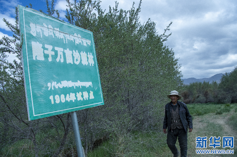 6月8日,索朗拉杰在介紹當(dāng)年試種沙棘、楊樹、榆樹等的情況。新華網(wǎng) 旦增努布 攝