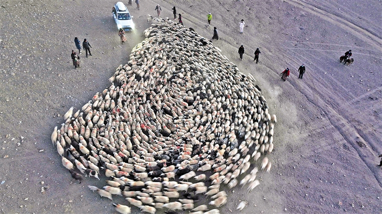 海拔5000米、3公里冰道,上千只羊,在牧羊人的護(hù)送下,從普莫雍錯北岸涉冰踏雪,輾轉(zhuǎn)到湖心島過冬。這一沿襲千年的獨(dú)特牧業(yè)生產(chǎn)方式,是推瓦村人與大自然的默契,閃爍著古老的生存智慧。