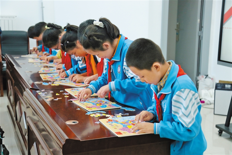 圖為學生參加“小小少年識地圖”拼圖比賽。記者 潘璐 攝