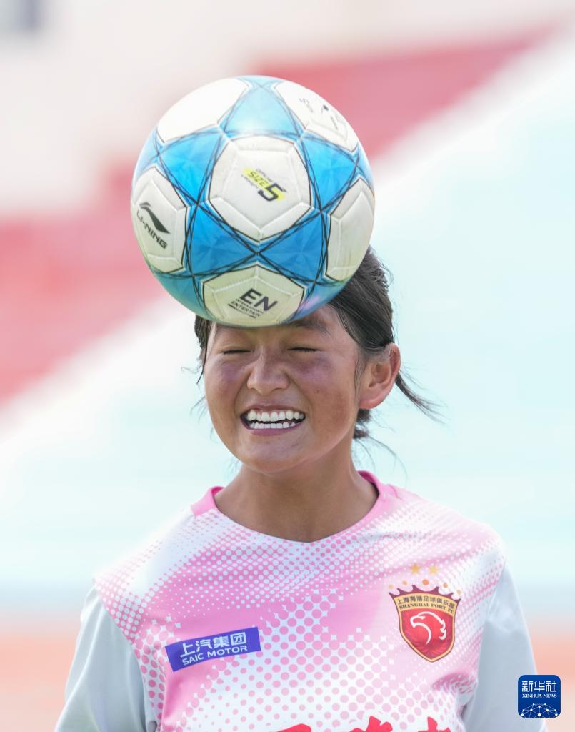 在西藏日喀則市上海實(shí)驗(yàn)學(xué)校操場上,“珠峰雪鷹”女子足球隊(duì)隊(duì)員旦增央金在訓(xùn)練頭球(9月3日攝)。新華社記者 丁汀 攝