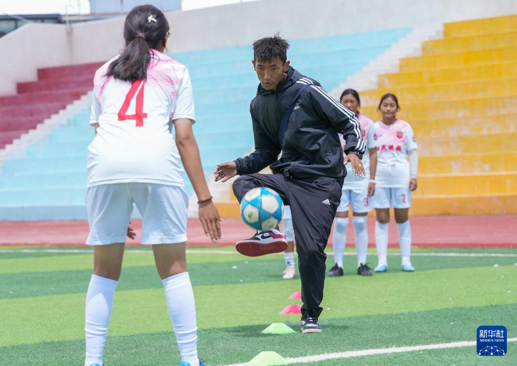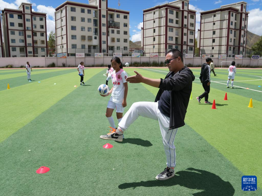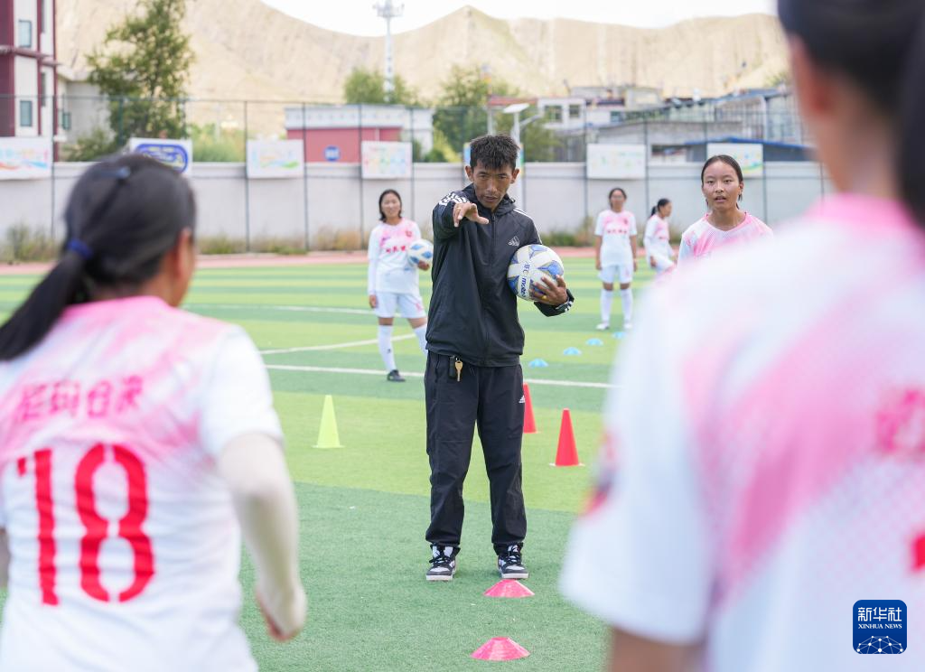西藏日喀則市上海實(shí)驗(yàn)學(xué)?!爸榉逖棥迸幼闱蜿?duì)教練洛布桑在操場上指導(dǎo)球員訓(xùn)練(9月3日攝)。新華社記者 丁汀 攝