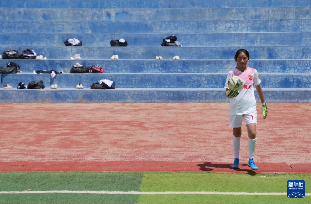 在西藏日喀則市上海實(shí)驗(yàn)學(xué)校,“珠峰雪鷹”女子足球隊(duì)守門員邊普在操場上訓(xùn)練(9月3日攝)。新華社記者 丁汀 攝