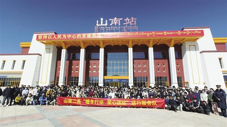 山南市第二高級中學(xué)“暖冬行動 愛心送站”送行服務(wù)隊和學(xué)生們合影。 圖由格桑央金提供