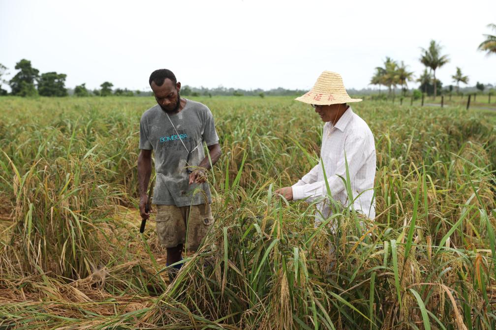 3月13日,在太平洋島國(guó)斐濟(jì)瑙索里鎮(zhèn),中國(guó)專家(右)在中國(guó)援斐濟(jì)農(nóng)業(yè)發(fā)展技術(shù)水稻項(xiàng)目試驗(yàn)示范培訓(xùn)基地查看暴雨過后水稻倒伏情況。新華社發(fā)(桑欽龍攝)