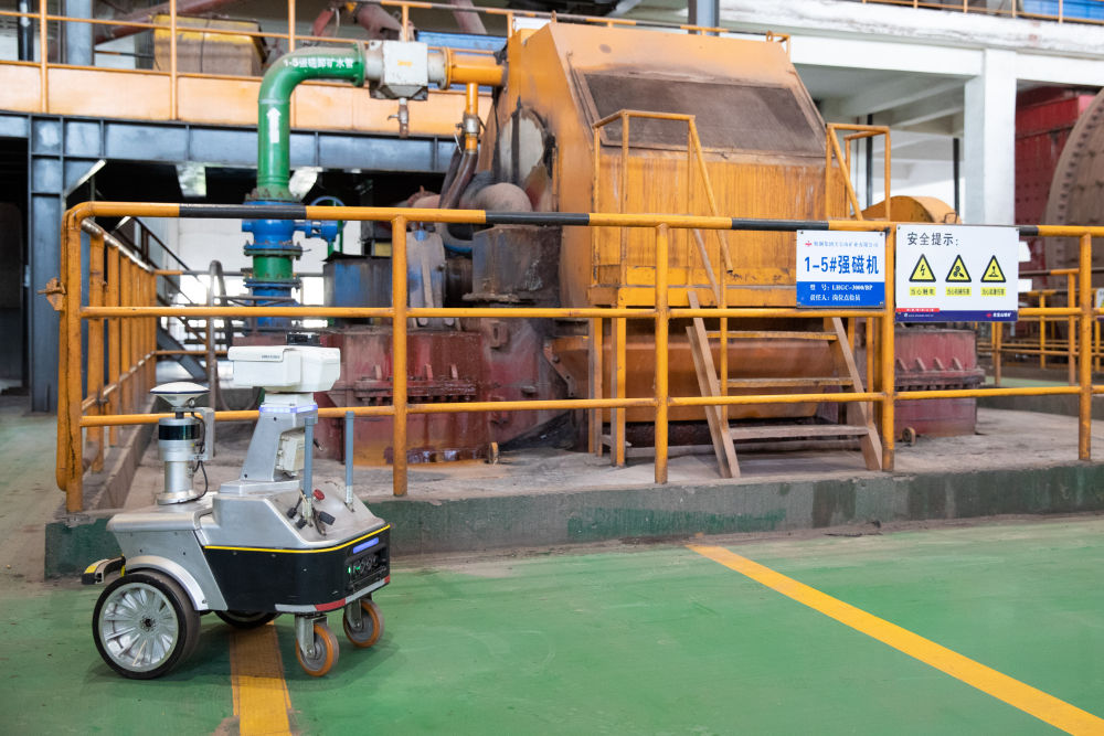生產(chǎn)現(xiàn)場無人化,依靠什么來實(shí)現(xiàn)?步入磨磁車間,巨大的轟鳴聲在這個(gè)長約100米、寬約50米、高約30米的廠房內(nèi)回響。登上二樓作業(yè)平臺,兩臺直徑6.2米的大型球磨機(jī)上的轉(zhuǎn)輪正在飛速旋轉(zhuǎn)。不遠(yuǎn)處,磨磁巡檢機(jī)器人閃爍著燈光,正在采集設(shè)備溫度、振動等狀態(tài)數(shù)據(jù)。