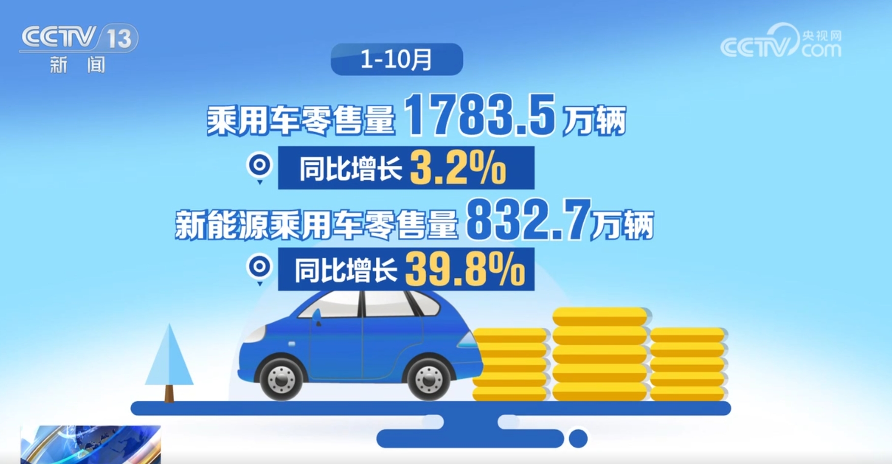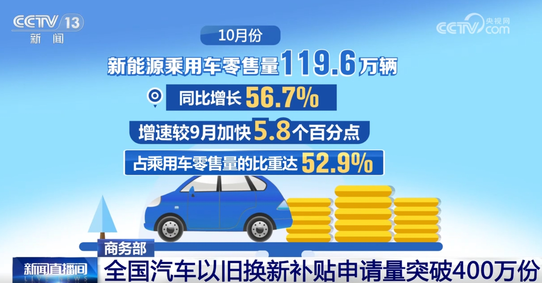 在以舊換新政策的帶動下,汽車銷量也有了明顯增長。10月份,乘用車零售量226.1萬輛,同比增長11.3%,增速較9月加快6.8個百分點。其中,新能源乘用車零售量119.6萬輛,同比增長56.7%,增速較9月加快5.8個百分點,占乘用車零售量的比重達(dá)52.9%。1—10月,乘用車零售量1783.5萬輛,同比增長3.2%。其中,新能源乘用車零售量832.7萬輛,同比增長39.8%。