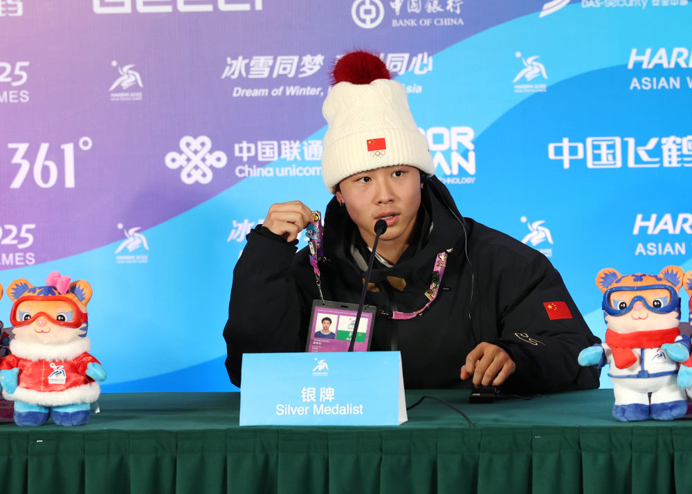 2月10日,中國選手姜鑫杰在發(fā)布會現(xiàn)場介紹他與其他運動員交換來的徽章。新華社記者 張晨霖 攝