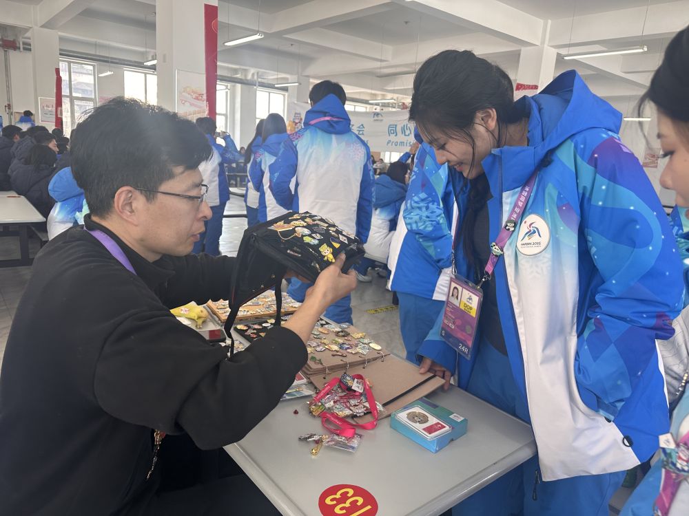 新華社哈爾濱2月13日電(記者戴錦镕、魏婧宇、馬思嘉)“你好,換‘pin’嗎?”在哈爾濱第九屆亞冬會各個場館,經(jīng)常能聽到以換“pin”破冰的對話。
