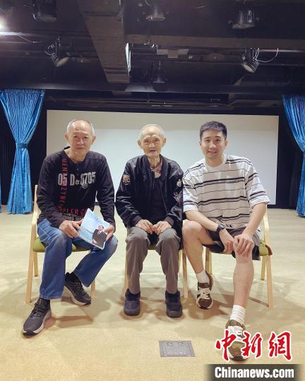 2023年5月8日,紀錄片《日暮·歸鄉(xiāng)》導(dǎo)演楊正濃與臺灣老兵金英次子金士杰(左一)、“感動中國”人物高秉涵(中)在臺北交流。(片方供圖)