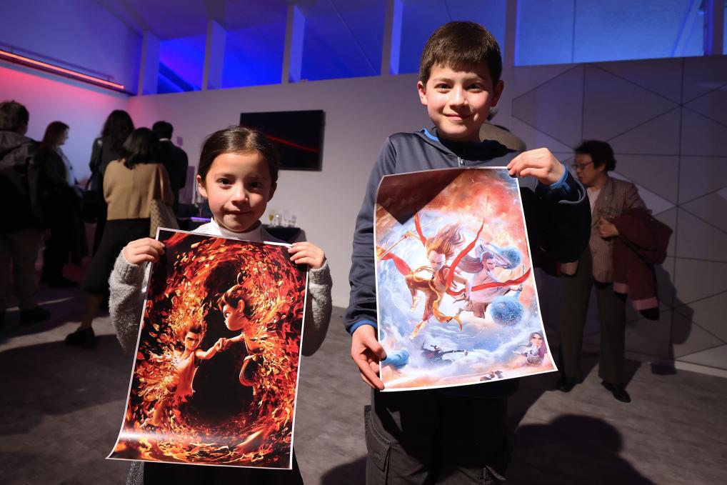3月26日,在比利時(shí)布魯塞爾,小朋友在《哪吒之魔童鬧海》首映活動(dòng)上手持海報(bào)合影。新華社記者趙丁喆攝