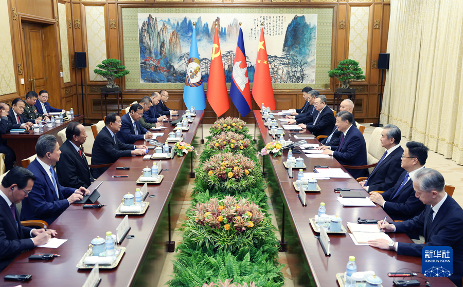 12月3日,中共中央總書記、國家主席習(xí)近平在北京釣魚臺國賓館同柬埔寨人民黨主席、參議院主席洪森舉行會談。新華社記者 謝環(huán)馳 攝