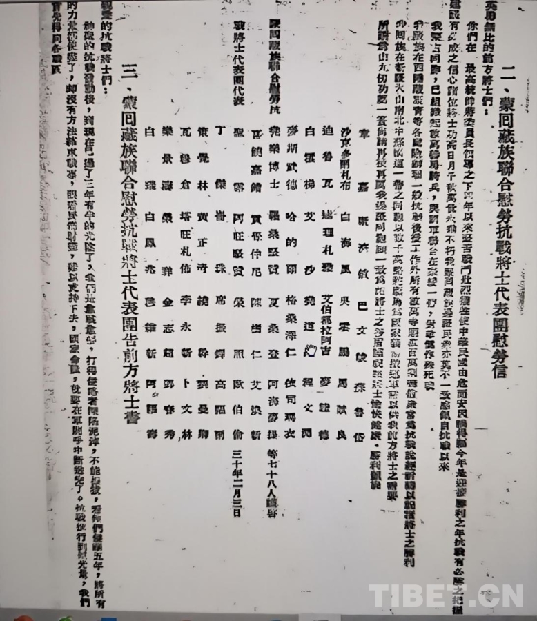 撫今追昔,再讀1941年2月由蒙、回、藏等各民族代表(藏族代表有喜饒嘉措、阿旺堅贊、貢覺仲尼、羅桑堅贊、格桑澤仁、丁杰、倫珠、策覺林、黃正清、劉曼卿、鄧春秀、繞干等)聯(lián)署的《蒙回藏族聯(lián)合慰勞抗戰(zhàn)將士代表團(tuán)告前方將士書》(以下簡稱《告前方將士書》)(原擬赴各戰(zhàn)區(qū)慰問前線將士,因交通關(guān)系,未能成行),深感它不僅是一封跨越地理阻隔的致敬信,更是一曲蕩氣回腸的民族精神交響曲。當(dāng)我們將目光聚焦于這份文獻(xiàn)本身,會發(fā)現(xiàn)其中蘊(yùn)含的精神力量至今仍在激蕩。