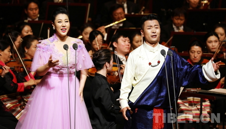 圖為中音歌唱家、國(guó)家一級(jí)演員霍勇,西藏自治區(qū)歌舞團(tuán)青年女高音次仁央宗領(lǐng)合唱《美麗的西藏 可愛的家鄉(xiāng)》 攝影:劉莉