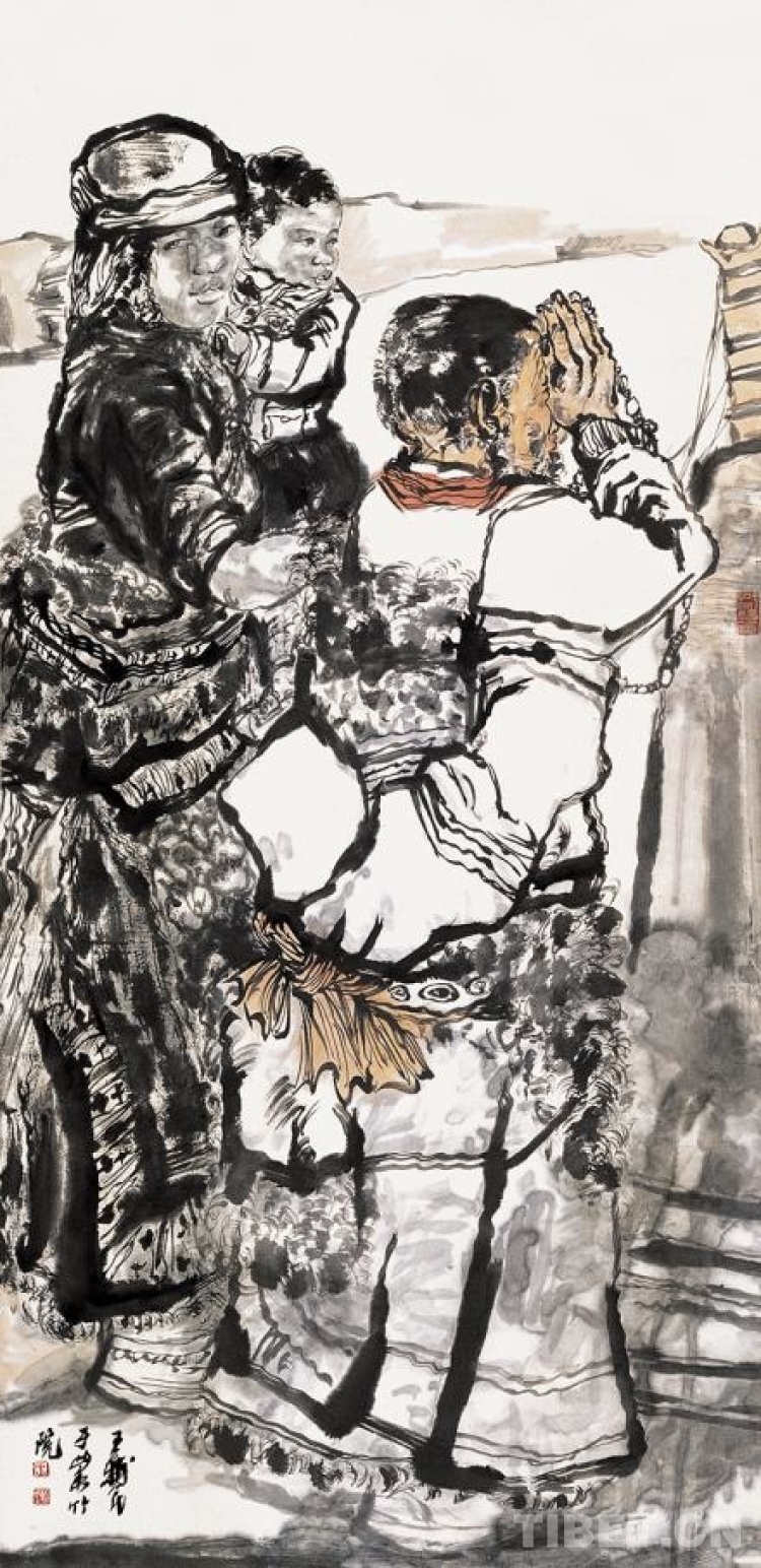 “真正深入當?shù)厝ンw驗藏族群眾的生活,創(chuàng)作出來的作品才會真實感人?!蓖踺o民在談到藏族題材的創(chuàng)作感悟時說,“青藏高原最吸引人的地方是生活在這里的人們飽滿的精神狀態(tài)。我們要敬畏自然,尊重文化,保持充滿感情、充滿崇敬之情的創(chuàng)作情感和態(tài)度,用中國畫的水墨形式去表現(xiàn)藏族群眾的生活,去表現(xiàn)雪域的蒼茫與藏族群眾頑強不屈的性格,表現(xiàn)人與自然的關系?!?/p>