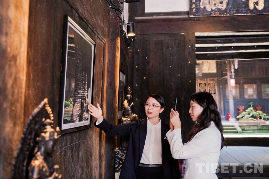 姜氏古茶第十五代傳承人萬姜紅(左)在中國西藏網(wǎng)視頻號(hào)直播時(shí)向廣大網(wǎng)友介紹姜家大院歷史和有關(guān)老照片的故事 楊洋供圖