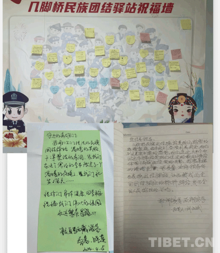 記者在社交媒體上也看到了很多游客以視頻、圖文等形式分享了他們和幾腳橋民族團(tuán)結(jié)驛站的故事?!耙驗楫?dāng)?shù)靥厥庠蛭覀兊娇h城沒有地住了,在小紅書上看到這個驛站可以留宿,實(shí)在沒有辦法去邊防檢查站詢問。邊防小哥哥了解原因后特別暖心立馬給我們安排住宿,洗漱用品樣樣不差,太贊啦!這是我這一路旅行睡得最香的一晚,主要還免費(fèi)!”一位游客半調(diào)侃地分享了自己的故事,還加了三張夜拍驛站的圖片。一張用外景,在夜里,“幾腳橋民族團(tuán)結(jié)驛站”漢藏雙語大牌十分醒目;一張室內(nèi)環(huán)境,左右兩邊的上下鋪床上放著四個“豆腐塊”被子,床單潔白如新,中間的小桌子上還放著氧氣罐、雜志、臺燈等用品;一張貼滿祝福與感謝的“便簽墻”……張張圖片體現(xiàn)了驛站工作人員的用心良苦,也定格著他難忘的定結(jié)記憶。
