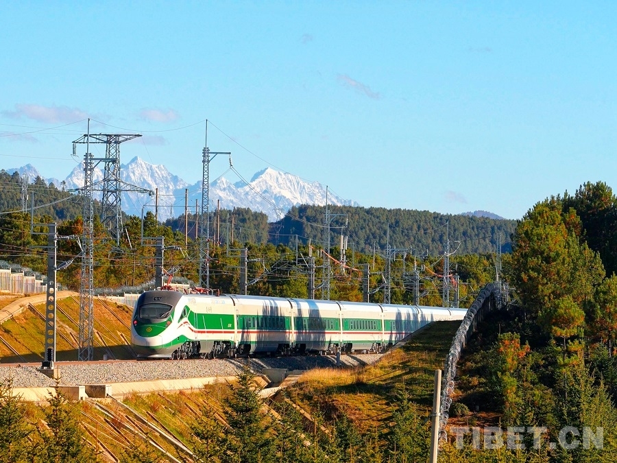 圖為復(fù)興號動車組行駛在滇藏鐵路麗香段上 迪慶日報社供圖