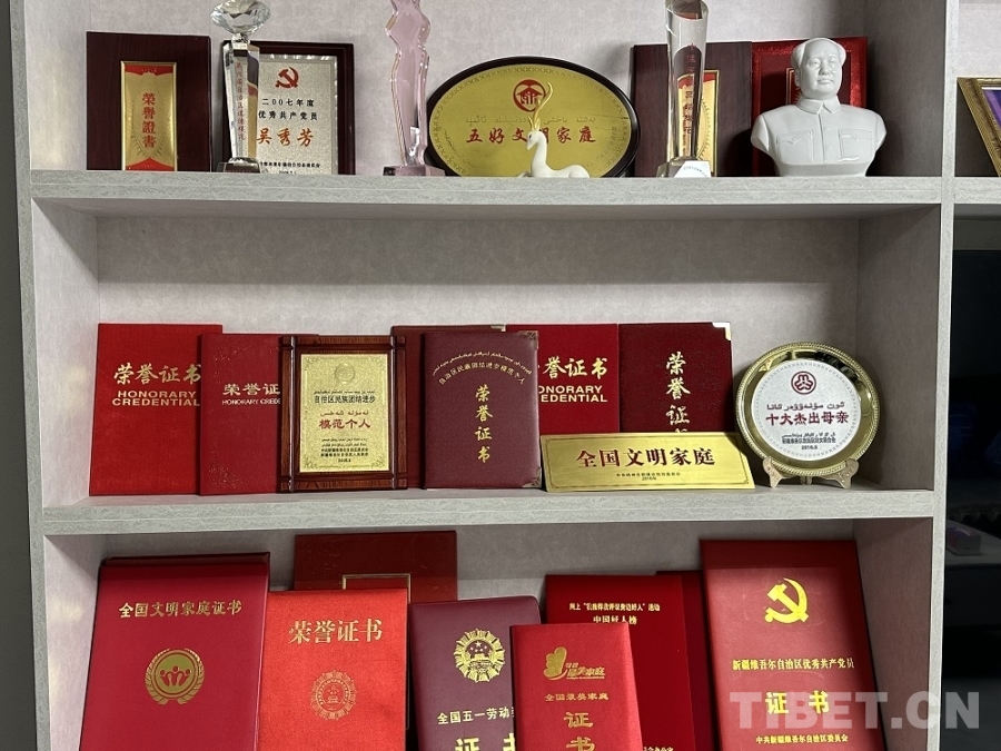 全國五一勞動獎章獲得者、全國民族團結進步模范個人,自治區(qū)民族團結進步模范個人、新疆“十大杰出母親”、全國文明家庭……記者走進吳秀芳老人家,一面碩大的榮譽墻映入眼簾,這些都是吳秀芳——這位錫伯族母親二十多年風雨歷程最好的見證。50年代出生的她,見證了新中國的成長,也經(jīng)歷了個人的坎坷與挑戰(zhàn)。