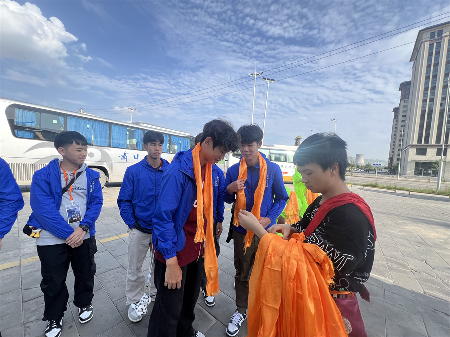 圖為青海當?shù)孛癖娤蛳愀埕缅\秋中學(xué)(屯門)學(xué)生獻哈達。攝影:李思琦老師
