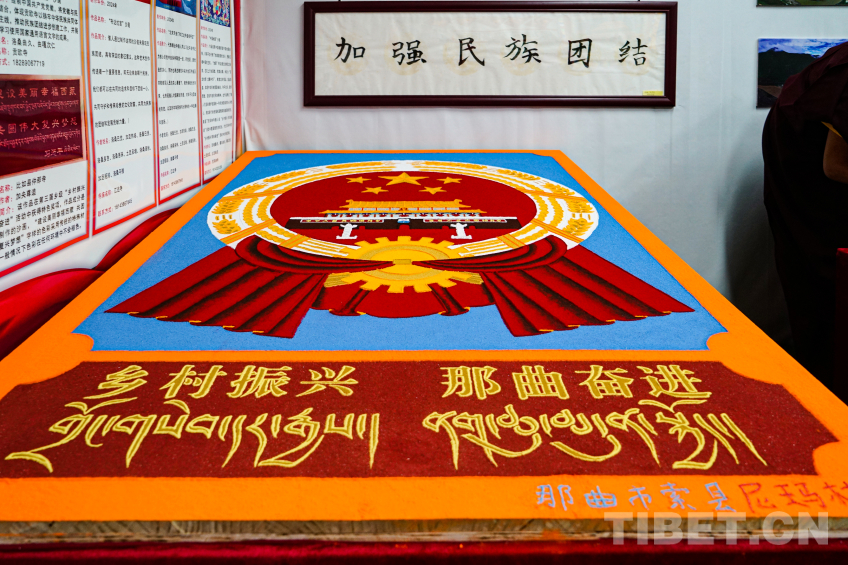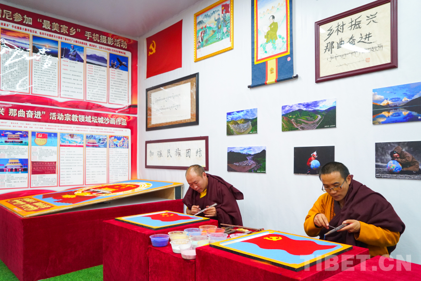 中國西藏網(wǎng)訊 2024年那曲恰青賽馬節(jié)暨第三屆“鄉(xiāng)村振興 那曲奮進(jìn)”活動(dòng)現(xiàn)場,兩位來自那曲市索縣加勤鄉(xiāng)尼瑪林寺的僧人用彩砂繪制工藝?yán)L制黨徽、國旗、國徽等彩砂作品,深切表達(dá)藏傳佛教僧人愛黨愛國愛教之情,用實(shí)際行動(dòng)踐行聽黨話、感黨恩、跟黨走,加深信教群眾對于祖國的熱愛。